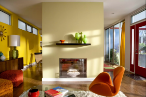 In this kitschy mid-century double living room decorated in poppy shades of orange, yellow, and green, a double-sided fireplace adds structure and separation to the otherwise open space.