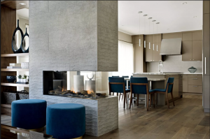 In this sophisticated home in Mississauga, a textured double-sided fireplace open on one side separates the kitchen and the family room while maintaining an airy feeling. “The kitchen and family room were completely redesigned and decorated with contemporary flair and functionality, adding a cohesive flow from room to room, “The rooms were remodeled to include lower seating and an open concept layout that was divided by a double-sided fireplace, exuding lush comfort.”