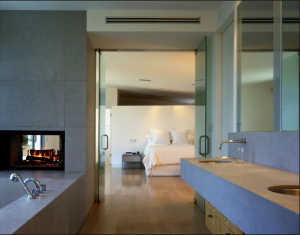 In this mid-century modern-inspired master bedroom suite, a streamlined bathroom with a polished concrete vanity and bathtub is outfitted with a black-framed double-sided fireplace at the head of the bathtub that affords a view of the fire and through to the uncluttered master bedroom. Wood floors warm up the concrete and pull the design together.