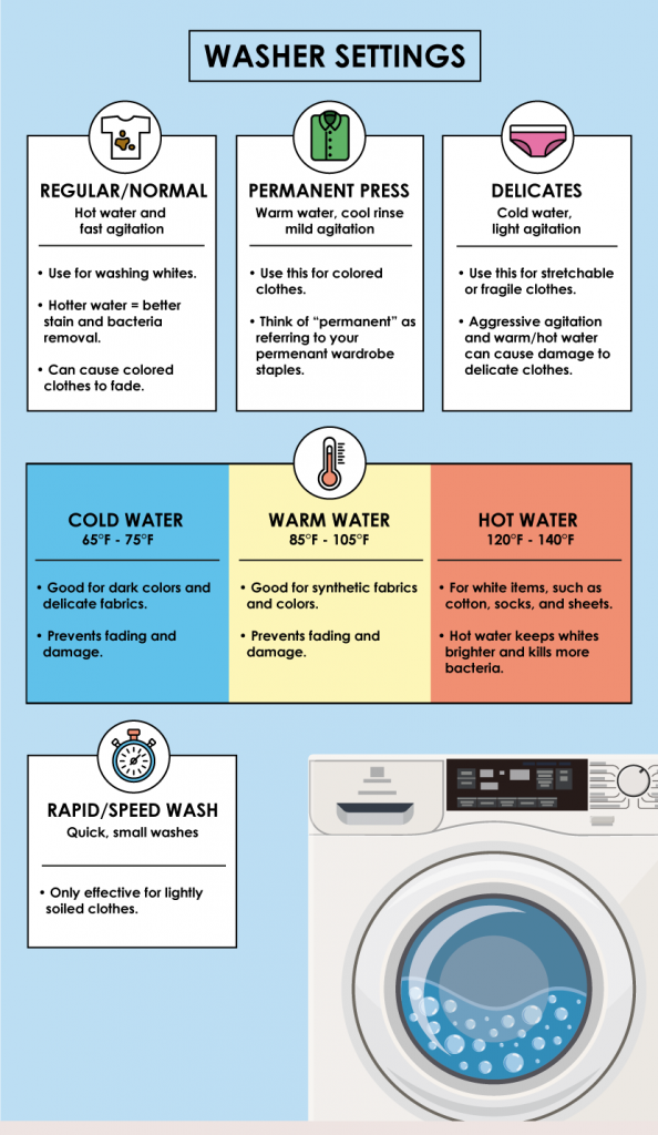 While some washing machines might not have a fanatical permanent-press fabric or Gentle setting, you’ll often replicate these conditions by manually selecting spin, temperature, and agitation settings: